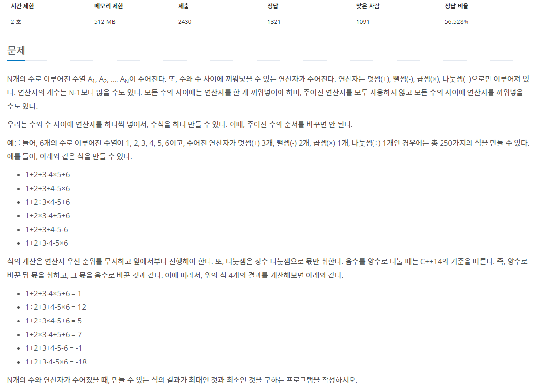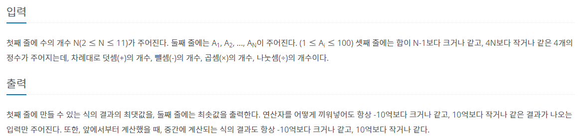 https://www.acmicpc.net/problem/14888 14888번: 연산자 끼워넣기 첫째 줄에 수의 개수 N(2 ≤ N ≤ 11)가 주어진다. 둘째 줄에는 A1, A2, ..., AN이 주어진다. (1 ≤ Ai ≤ 100) 셋째 줄에는 합이 N-1인 4개의..