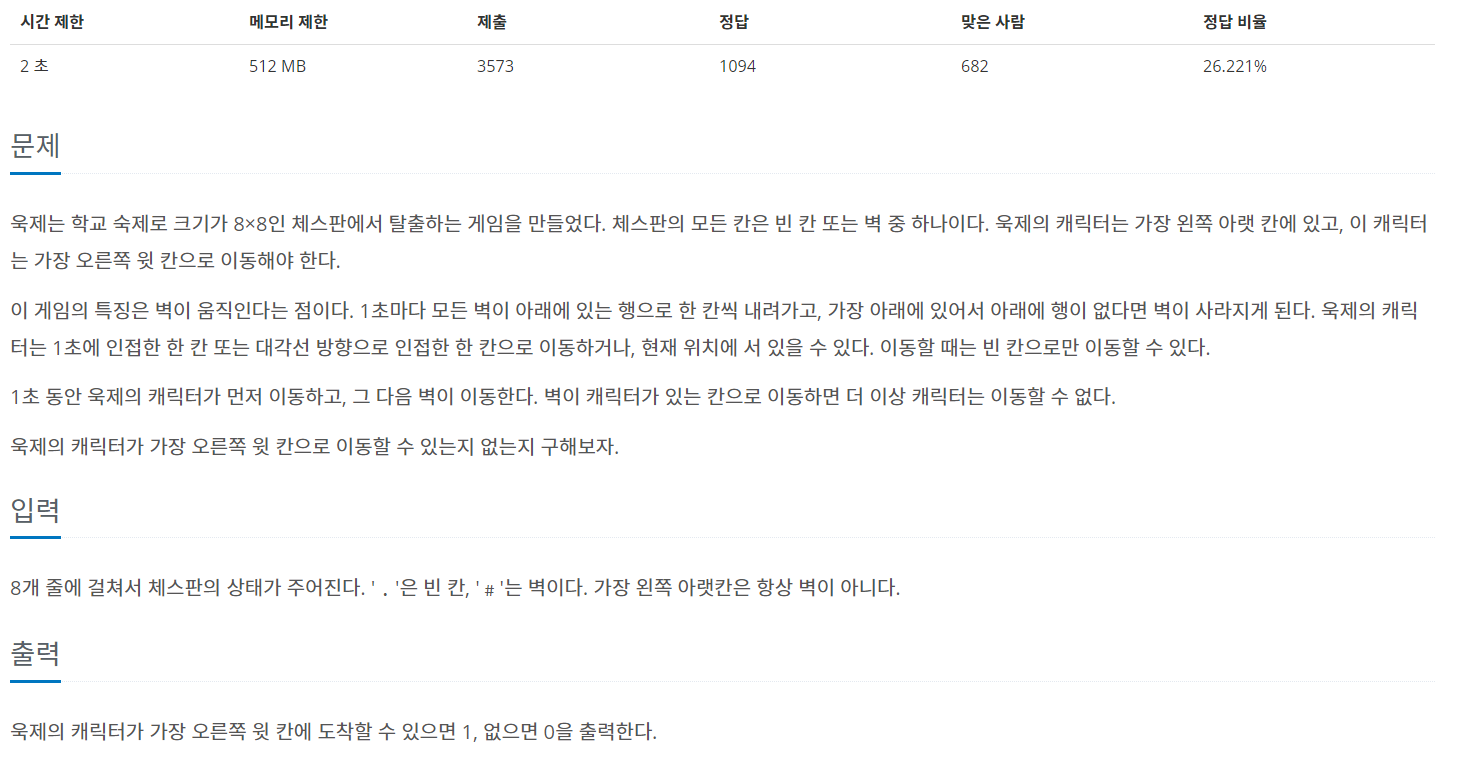 욱제는 학교 숙제로 크기가 8×8인 체스판에서 탈출하는 게임을 만들었다. 체스판의 모든 칸은 빈 칸 또는 벽 중 하나이다. 욱제의 캐릭터는 가장 왼쪽 아랫 칸에 있고, 이 캐릭터는 가장 오른쪽