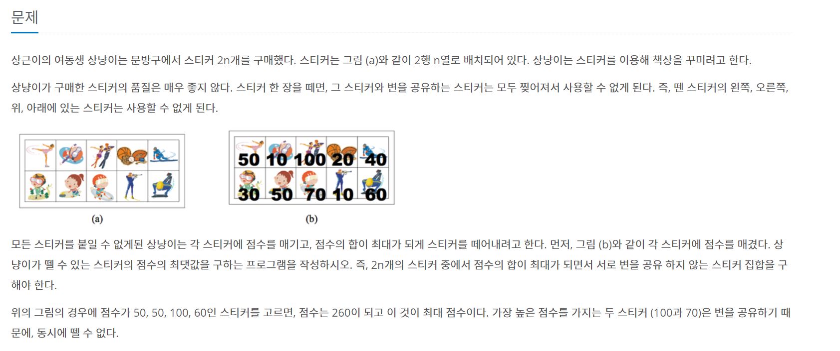 문제 상근이의 여동생 상냥이는 문방구에서 스티커 2n개를 구매했다. 스티커는 그림 (a)와 같이 2행 n열로 배치되어 있다. 상냥이는 스티커를 이용해 책상을 꾸미려고 한다. 상냥이가 구매한 스티
