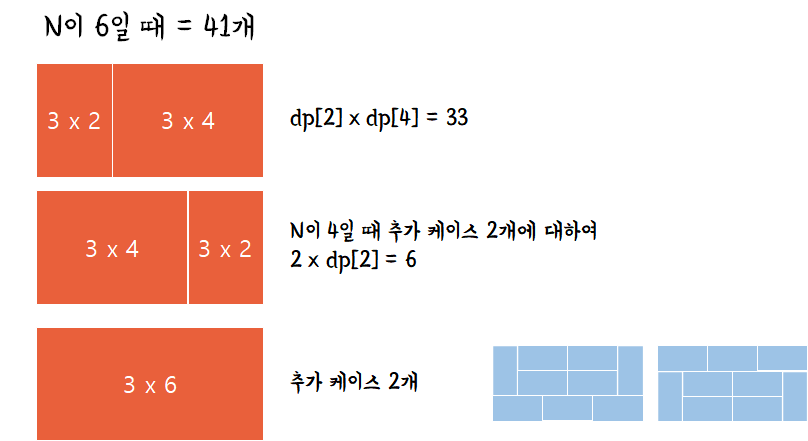 dp[x] = 3 * dp[x-2] + 2 * dp[x-4] + ··· + 2 * dp[0] (마지막 항은 추가케이스 2개 더하는 항)