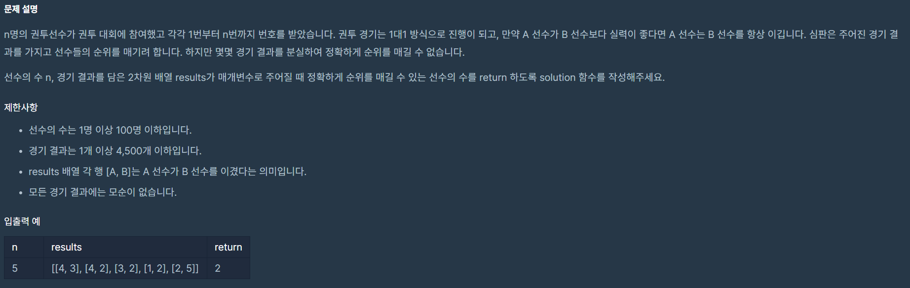 //해당 선수 위 아래로 n-1명 있으면 그 선수의 순위는 정확하게 알 수 있음