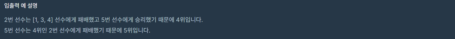 1. 각 선수들이 이긴 선수들의 번호와 진 선수들의 번호를 따로 저장하였다.