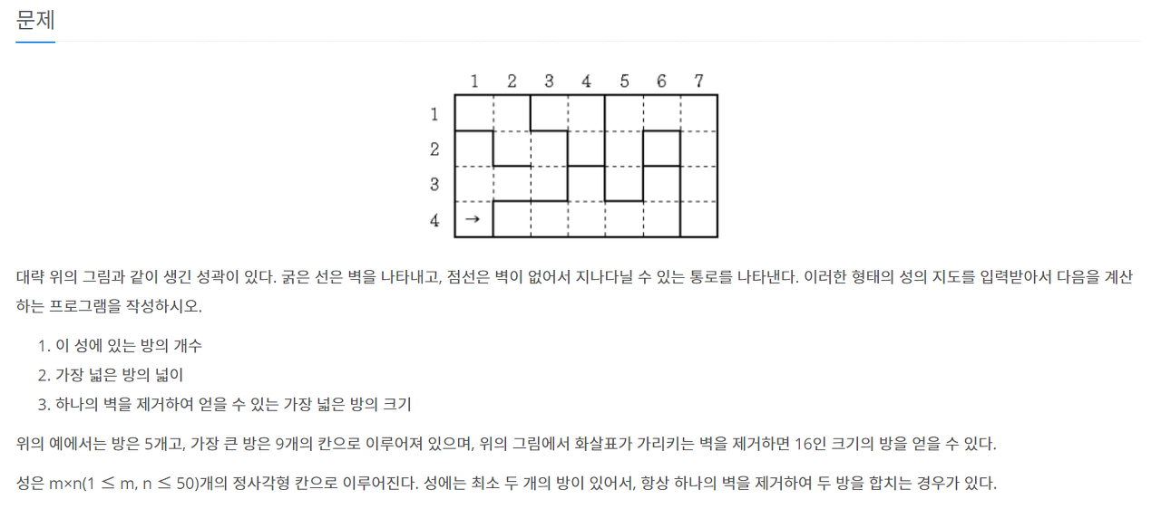 →존재하는 벽을 하나씩 다 없애보면 된다. 해당 칸의 값과 1,2,4,8을 &연산하여 벽이 있으면 그 값을 빼고 bfs실행하여 방의 크기를 구할 수 있다.
