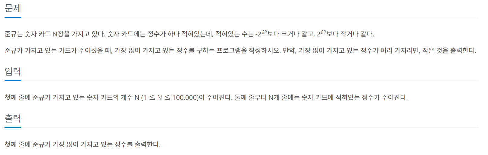 준규는 숫자 카드 N장을 가지고 있다. 숫자 카드에는 정수가 하나 적혀있는데, 적혀있는 수는 -262보다 크거나 같고, 262보다 작거나 같다. 준규가 가지고 있는 카드가 주어졌을 때, 가장 많이 가지