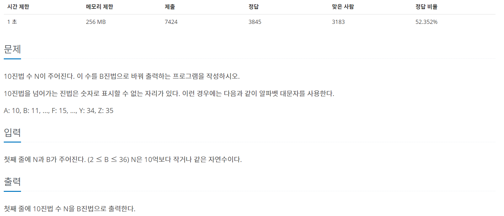 10진법 수 N이 주어진다. 이 수를 B진법으로 바꿔 출력하는 프로그램을 작성하시오. 10진법을 넘어가는 진법은 숫자로 표시할 수 없는 자리가 있다. 이런 경우에는 다음과 같이 알파벳 대문자를 ��