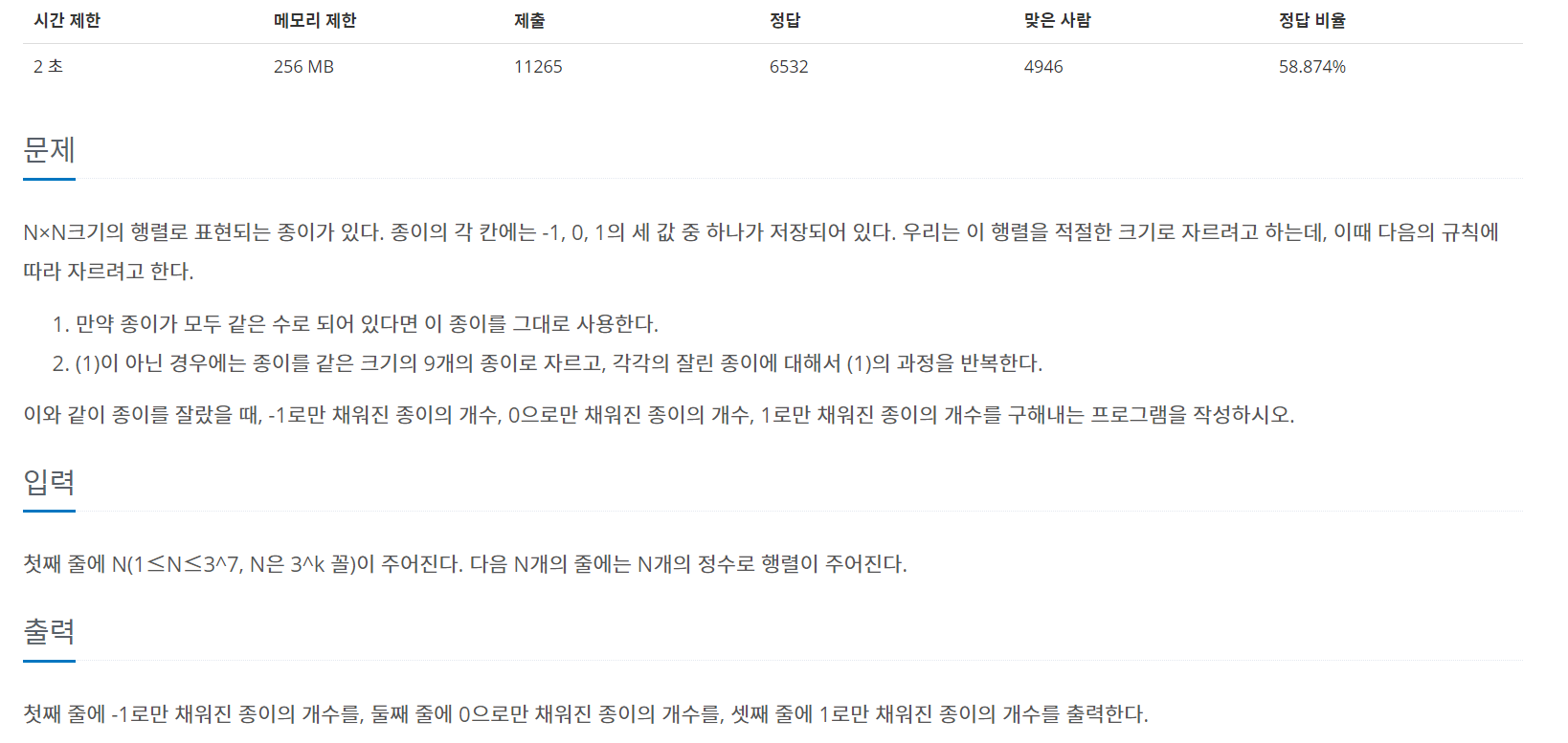 N×N크기의 행렬로 표현되는 종이가 있다. 종이의 각 칸에는 -1, 0, 1의 세 값 중 하나가 저장되어 있다. 우리는 이 행렬을 적절한 크기로 자르려고 하는데, 이때 다음의 규칙에 따라 자르려고 한다.