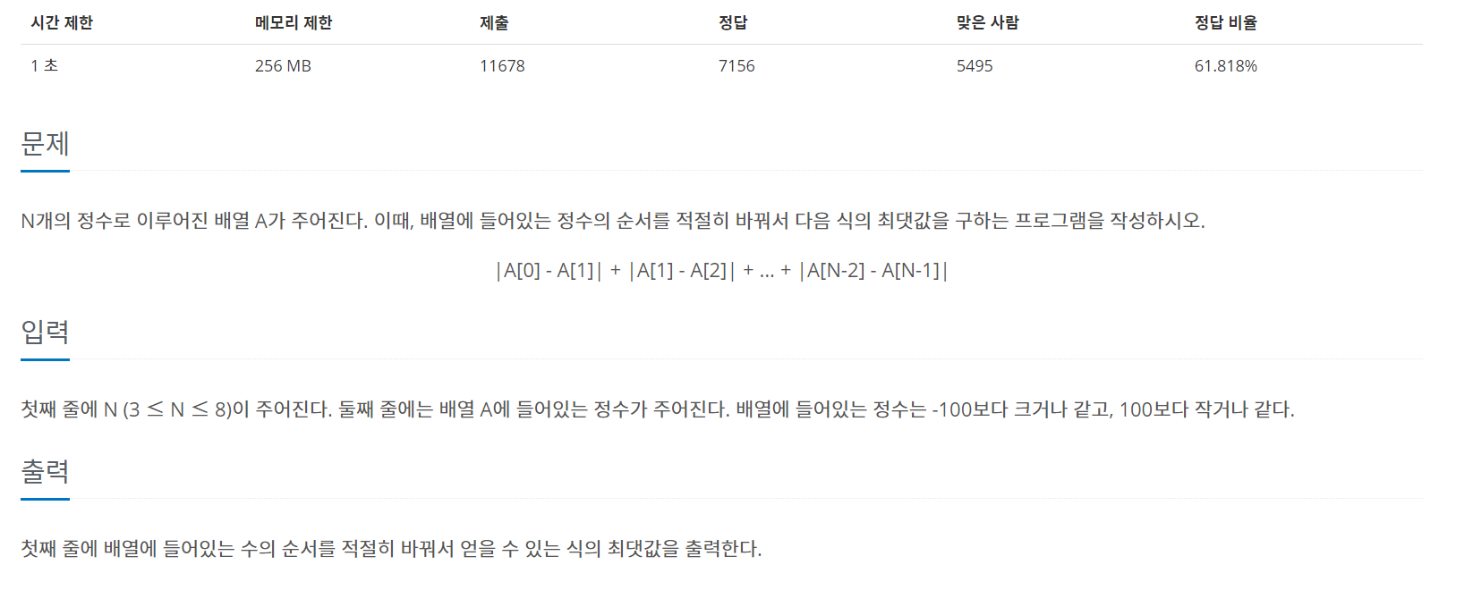 첫째 줄에 N (3 ≤ N ≤ 8)이 주어진다. 둘째 줄에는 배열 A에 들어있는 정수가 주어진다. 배열에 들어있는 정수는 -100보다 크거나 같고, 100보다 작거나 같다.