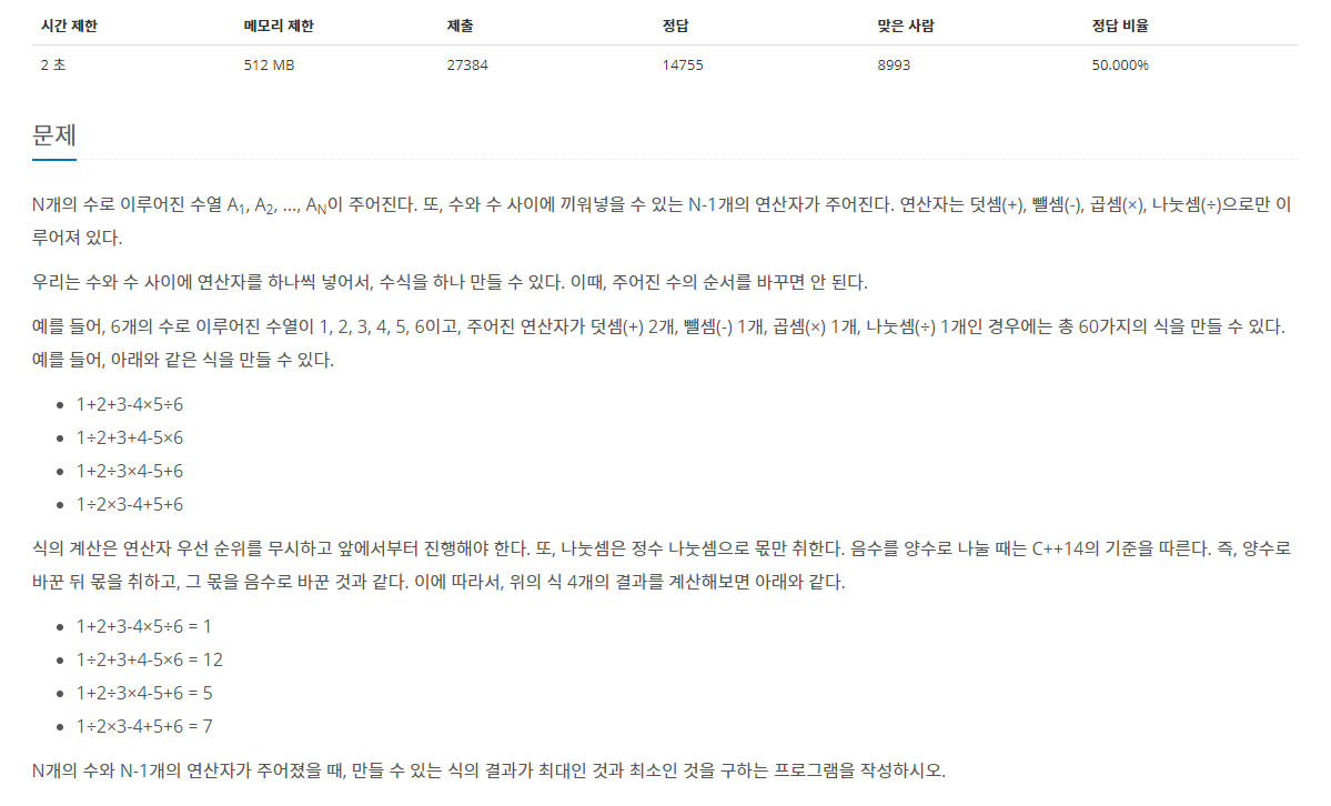 주어진 연산자를 나열하는 모든 경우에 대해 계산을 하고, 최소값과 최대값을 저장한다.