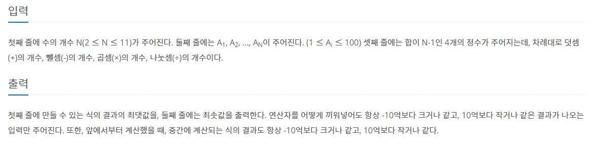 첫째 줄에 수의 개수 N(2 ≤ N ≤ 11)가 주어진다. 둘째 줄에는 A1, A2, ..., AN이 주어진다. (1 ≤ Ai ≤ 100) 셋째 줄에는 합이 N-1인 4개의 정수가 주어지는데, 차례대로 덧셈(+)의 개수, 뺄셈(-)의 개수, ��